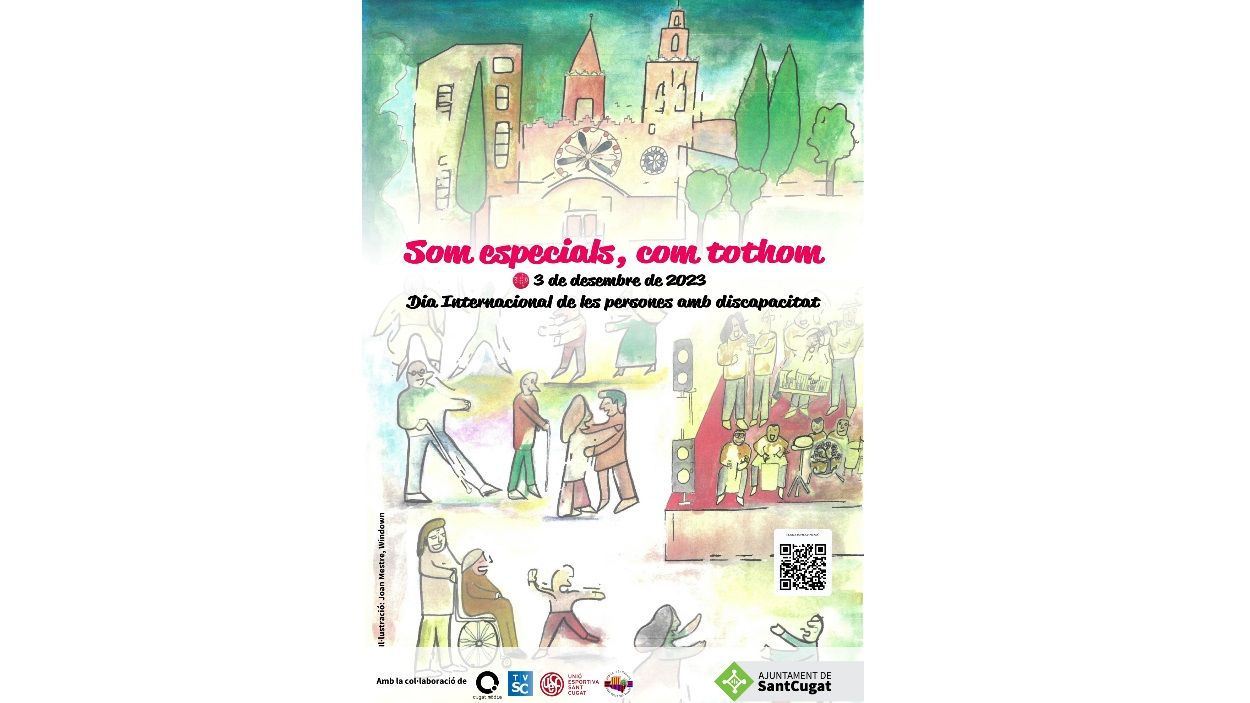 3 de desembre Dia Internacional de les persones amb Discapacitat ‘Som especials, com tothom’. La jornada inclou una Fira d’entitats socials, de 10 a 14 h a la plaça d’Octavià amb un concert del grup Árboles Amarillos, sessió de zumba amb Grup Catalònia, la lectura del manifest i showcooking en viu amb l’Aula Gastronòmica. També l’emissió a TV Sant Cugat dels debats ‘Envelliment i discapacitat’ i ‘Parlem d’Autisme’. CONSULTA LA PROGRAMACIÓ COMPLETA AQUÍ