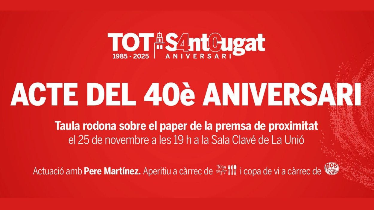 Amb l’actuació del ‘cantaor’ de flamenc santcugatenc Pere Martínez, qui encetarà l’acte i també el clourà amb una sorpresa final. Es donarà a conèixer la publicació especial ’40 anys, 40 moments clau’, que els assistents podran adquirir-la sense cost, i que també anirà amb el ‘TOT’ del divendres 28.