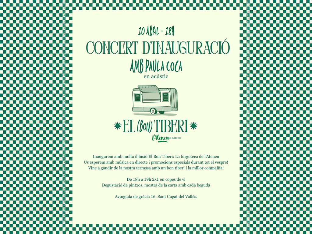 La inauguració i apertura oficial de El Bon Tiberi, el nou projecte gastronòmic de la furgoteca de l’Ateneu, serà el pròxim 10 d’abril a partir de les 18 h. Per celebrar-ho, comptaran amb el concert acústic de Paula Coca i ens conviden a venir a gaudir de la terrassa en un vespre pensat per compartir, brindar i començar a fer barri. Durant la tarda hi haurà 2×1 en copes de vi de 18h a 19h, així com degustació de pintxos i una mostra de la seva carta amb cada beguda, perquè pugueu començar a descobrir la proposta gastronòmica que estan preparant.