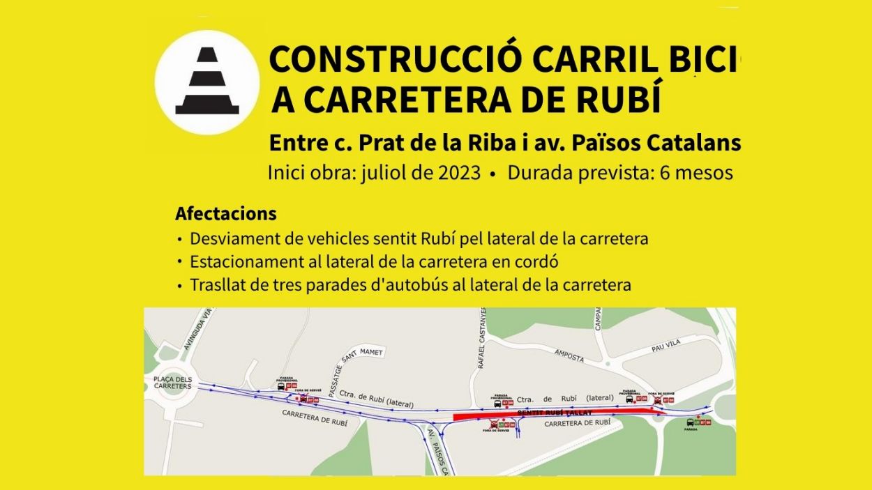 El tram de la carretera de Rubí entre el carrer de Prat de la Riba i l’avinguda dels Països Catalans en sentit Rubí queda inhabilitat a partir d’aquest dilluns i durant sis mesos amb motiu de les obres de construcció del carril bici que unirà Sant Cugat amb la ciutat veïna en bicicleta. Aquest pas de vehicles es desviarà al lateral de la carretera i, per garantir la seguretat, l’aparcament es farà en cordó. El transport públic també es veu afectat a la zona, amb l’anul·lació de les parades que hi ha a l’altura de l’Institut FP, del Jardiland i del carrer del Prat de la Riba, que es traslladen també al lateral. Això sí, els accessos a Jardiland es mantindran oberts.