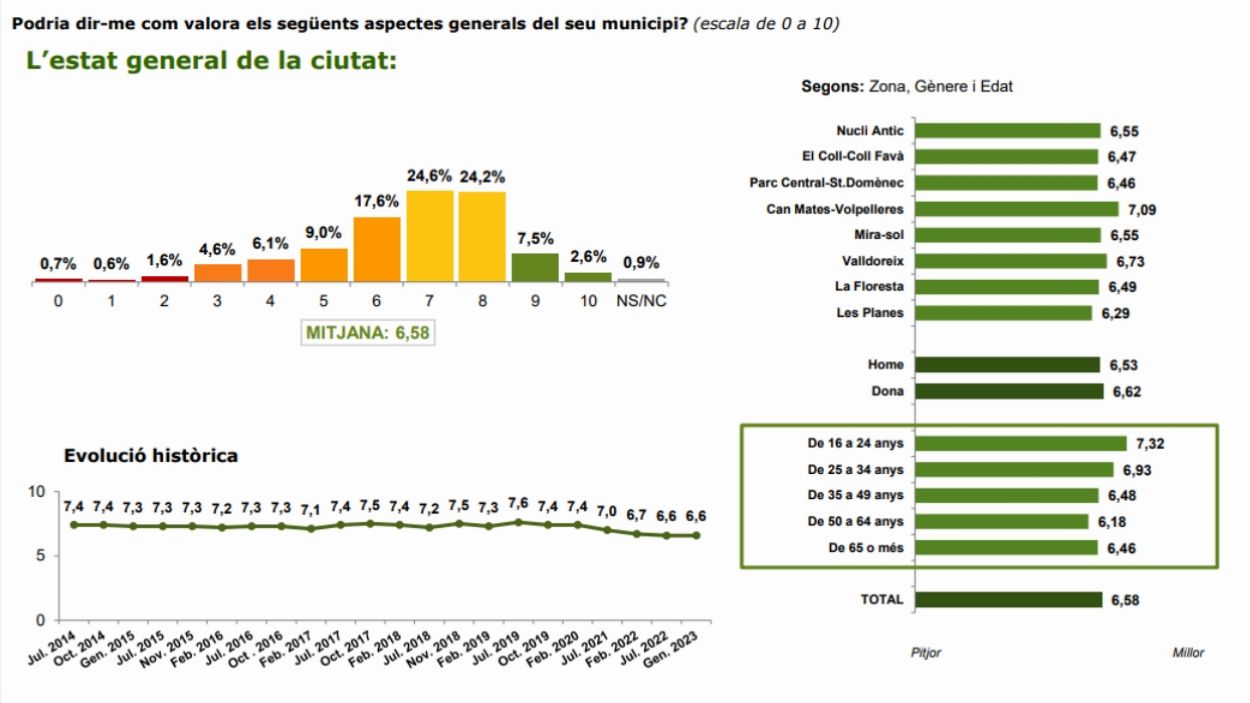 Aquesta xifra contrasta amb la nota que li posen els enquestats a l’estat de la ciutat, un 6,6, la mateixa que en l’Observatori del juliol passat, que ja era la més baixa dels últims anys. Els més joves (16-24 anys) són els que valoren millor la ciutat amb un 7,3.