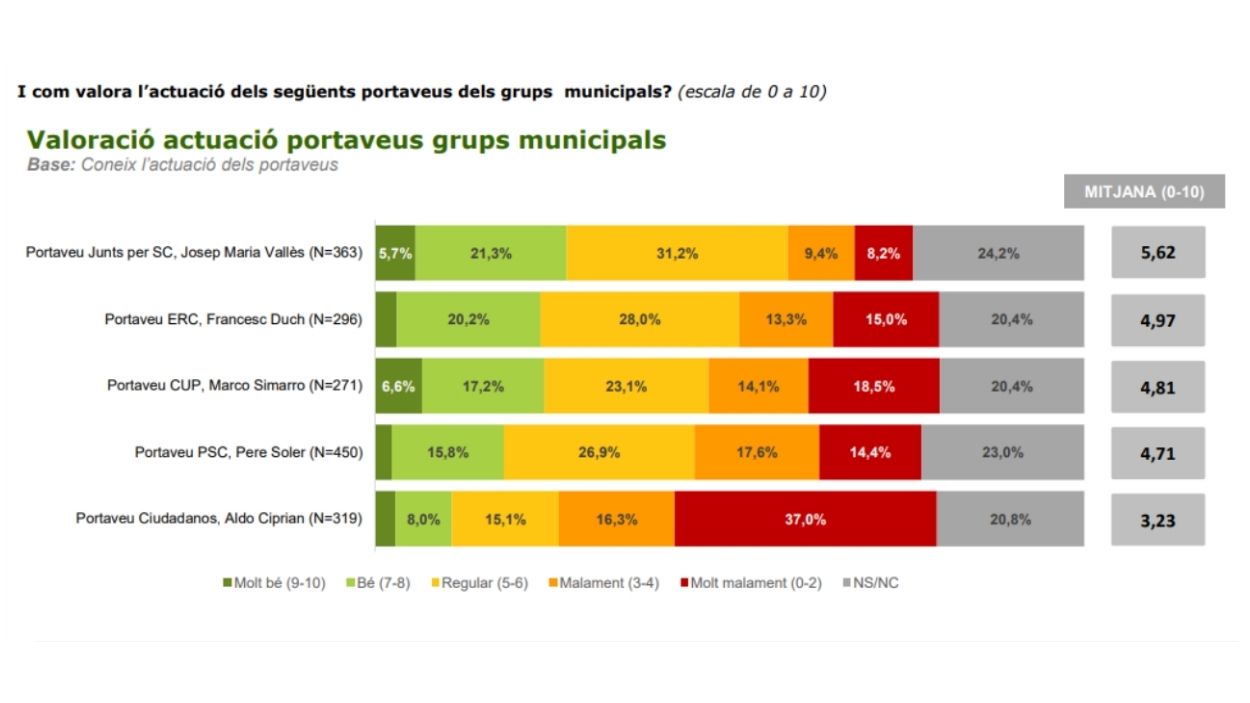Per barris, el veïnat del Parc Central, Sant Domènec i la Floresta són els únics que suspenen l’alcaldessa, mentre que la millor nota li posen les dones (5,45). Pel que fa a la valoració dels portaveus dels grups municipals, en aquesta onada s’ha preguntat per primer cop pel de Junts, Josep Maria Vallès, i pel de la CUP-PC, Marco Simarro, ja que el juliol passat encara ho eren Carmela Fortuny i Núria Gibert. Dels cinc portaveus, el més conegut és del socialista Pere Soler, seguit de Josep Maria Vallès (Junts), Aldo Ciprian (Cs), Francesc Duch (ERC-MES) i Marco Simarro (CUP-PC). La seva valoració, però, no segueix el mateix ordre. Vallès és el polític més valorat -per sobre de la nota de l’alcaldessa-, mentre que Ciprian és qui treu pitjor nota.