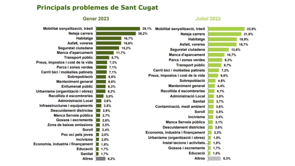 Pel que fa als temes que més preocupen als santcugatencs enquestats, la mobilitat i la neteja continuen sent les dues primeres de la llista, però el percentatge de vots ha crescut respecte a l’últim Observatori del mes de juliol. En canvi, la preocupació per l’habitatge i l’asfalt i les voreres s’ha reduït.