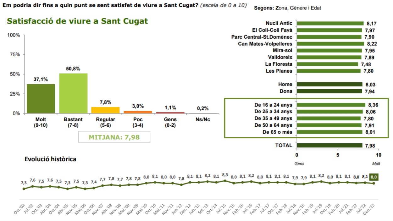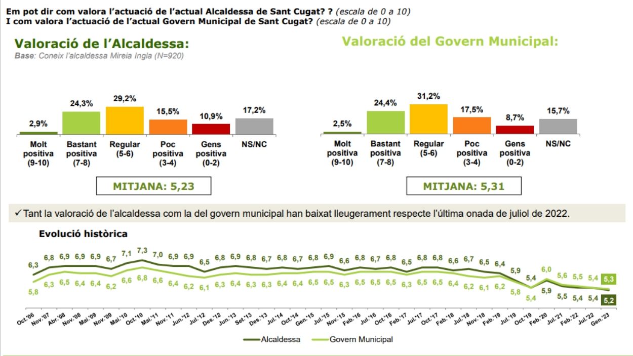 El veïnat de Sant Cugat està molt satisfet de viure a la ciutat. Segons l’últim Observatori Sociològic, els santcugatencs valoren amb un 8 de mitjana la seva vida a Sant Cugat, però, en canvi, la nota baixa fins a 6,6 quan se’ls pregunta per l’estat de la ciutat. Aquesta xifra és la més baixa des del 2014. Pel que fa a la valoració del govern i els polítics, el govern municipal actual treu un 5,3, i l’alcaldessa, Mireia Ingla, un 5,2. Les dues són les notes més baixes des del 2020. El polític més ben valorat és Josep Maria Vallès, l’alcaldable de Junts, amb un 5,6.