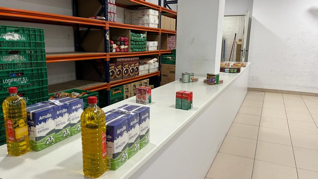 Taulell on es posen els productes i aliments que repartiran entre les persones necessitades / Cugat Mèdia