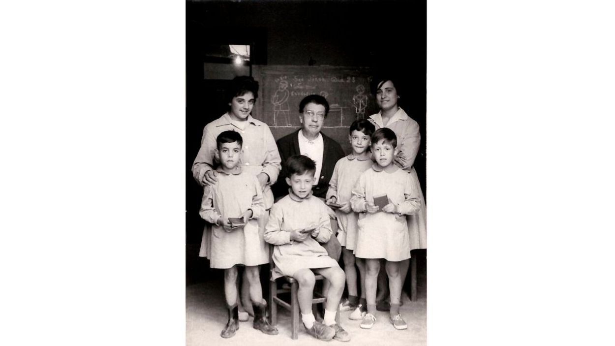 Una foto de la mestra i les ajudants de l’escola Ave Maria amb els alumnes que fèien la primera comunió el 1961 / Cedida per Dolors Gabernet