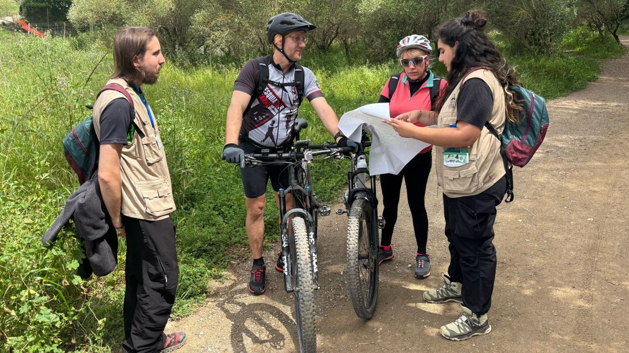Una de les dues parelles d’informadors del Parc Natural de Collserola explicant a dos ciclistes per on poden circular per tenir cura de l’espai / Cugat Mèdia