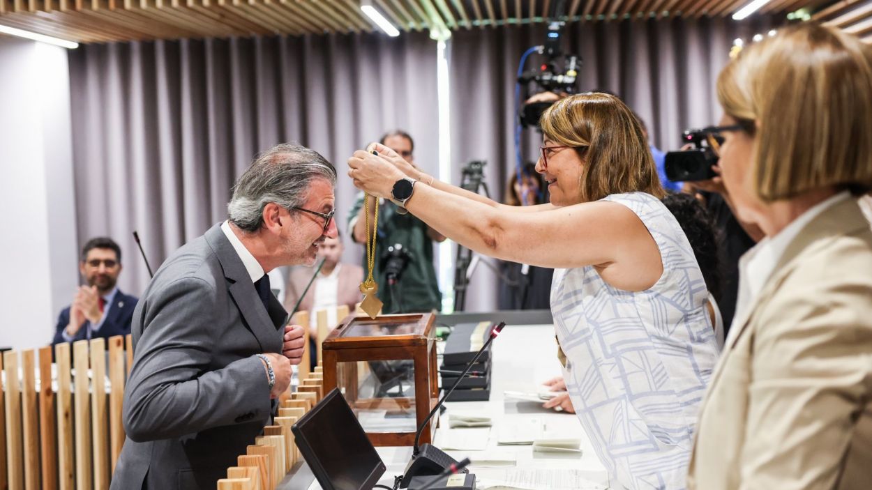 Josep Maria Vallès rep la medalla d’alcalde de mans de la regidora del PSC Pilar Gorina / Ajuntament