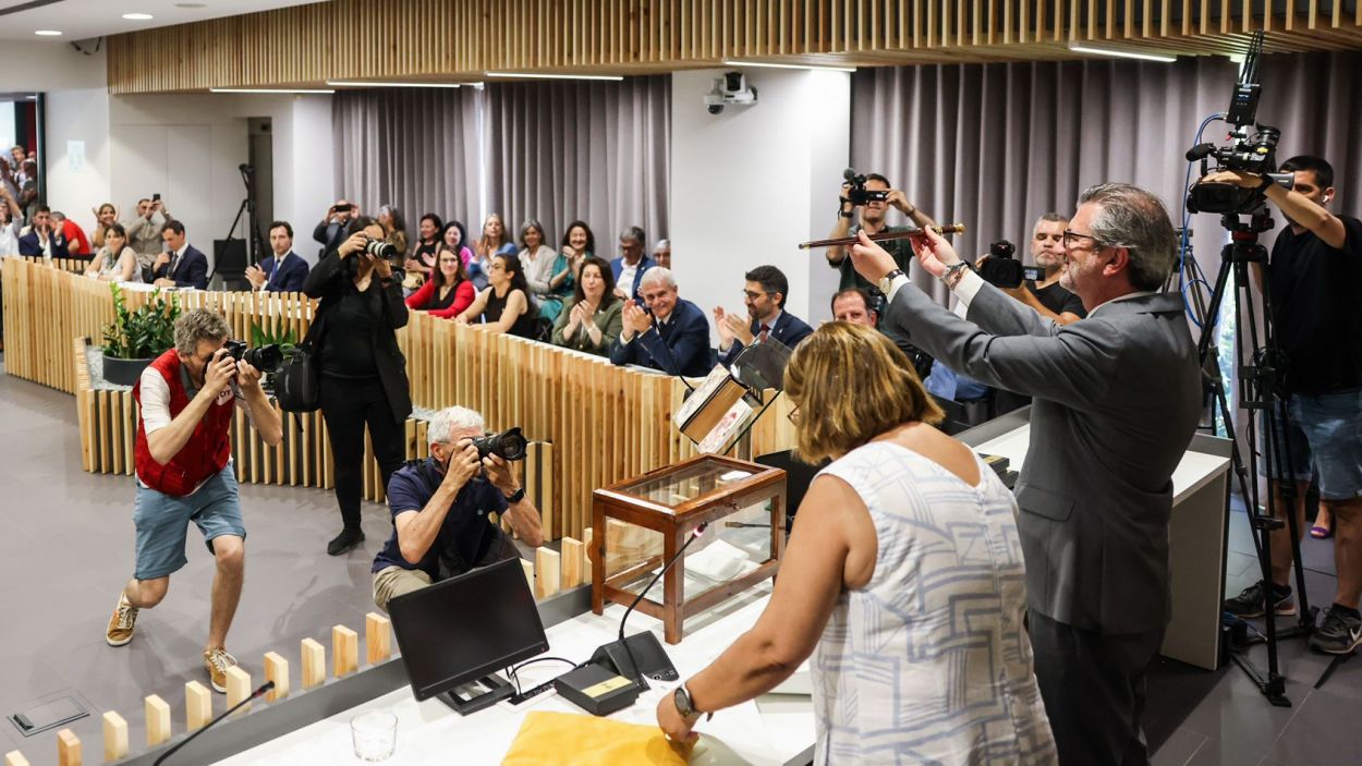 La nova sala de plens estava plena com un ou. De fet, s’ha hagut d’habilitar l’OAC i la sala Noble per encabir a familiars, exregidors i ciutadans que no s’han volgut perdre un dia com aquest. Qui tampoc s’ha volgut perdre el gran dia de Josep Maria Vallès és el secretari general de Junts, Jordi Turull, que anys enrere va ser gerent de l’Ajuntament santcugatenc. Curiosament, ni Turull ni la presidenta del partit, Laura Borràs, van venir a fer costat a Vallès en cap acte de campanya, per desig exprés de l’actual alcalde. Malgrat tot, Turull ha escollit Sant Cugat, de tots els municipis que aquest dissabte al matí escollien un alcalde de Junts, i Vallès li ho ha agraït amb una càlida abraçada.