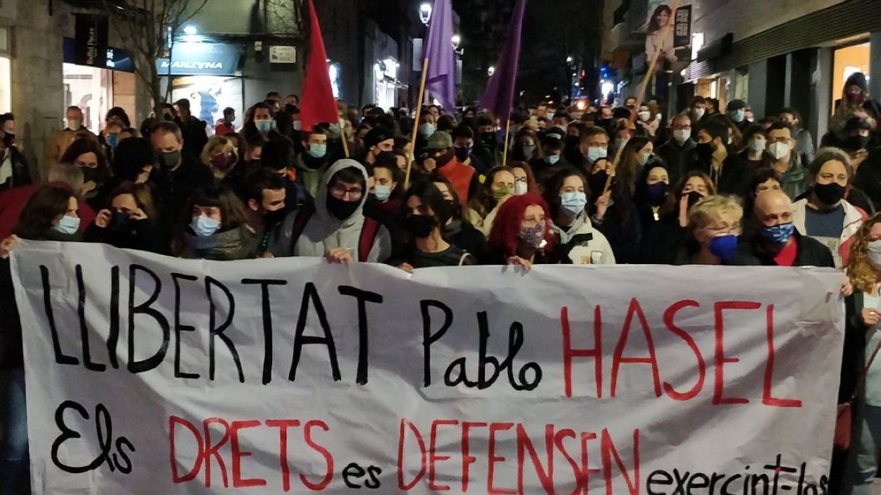 La protesta ha arrencat a la plaça de Lluís Millet i ha avançat per l’eix comercial fins a arribar a la plaça de l’U d’Octubre. No ha estat casual que la manifestació hagi acabat aquí: fins al 2018, aquest espai es deia plaça del Rei. Quan ha acabat la protesta, els assistents han cremat fotos de la família reial espanyola. Al manifest, han assenyalat el que consideren una doble moralitat: lamenten que Hasél sigui a presó per expressar “idees que incomoden els poderosos” i es pregunten per què Vox té dret a dir “que la culpa de tot és de les persones migrades o de l’independentisme”, que “no existeix la violència masclista” o “mostrar orgull pel cop d’estat franquista”. “Està clar que no hi ha llibertat d’expressió, que es permet allò que interessa al poder, com és la ultradreta, i es persegueix allò que incomoda”, recull el manifest. Les entitats que han convocat la protesta asseguren que, amb l’empresonament de Hasél, “ataquen també a totes les antiracistes, antifeixistes, comunistes, feministes, independentistes, anarquistes” i les que volen “un món més just”.