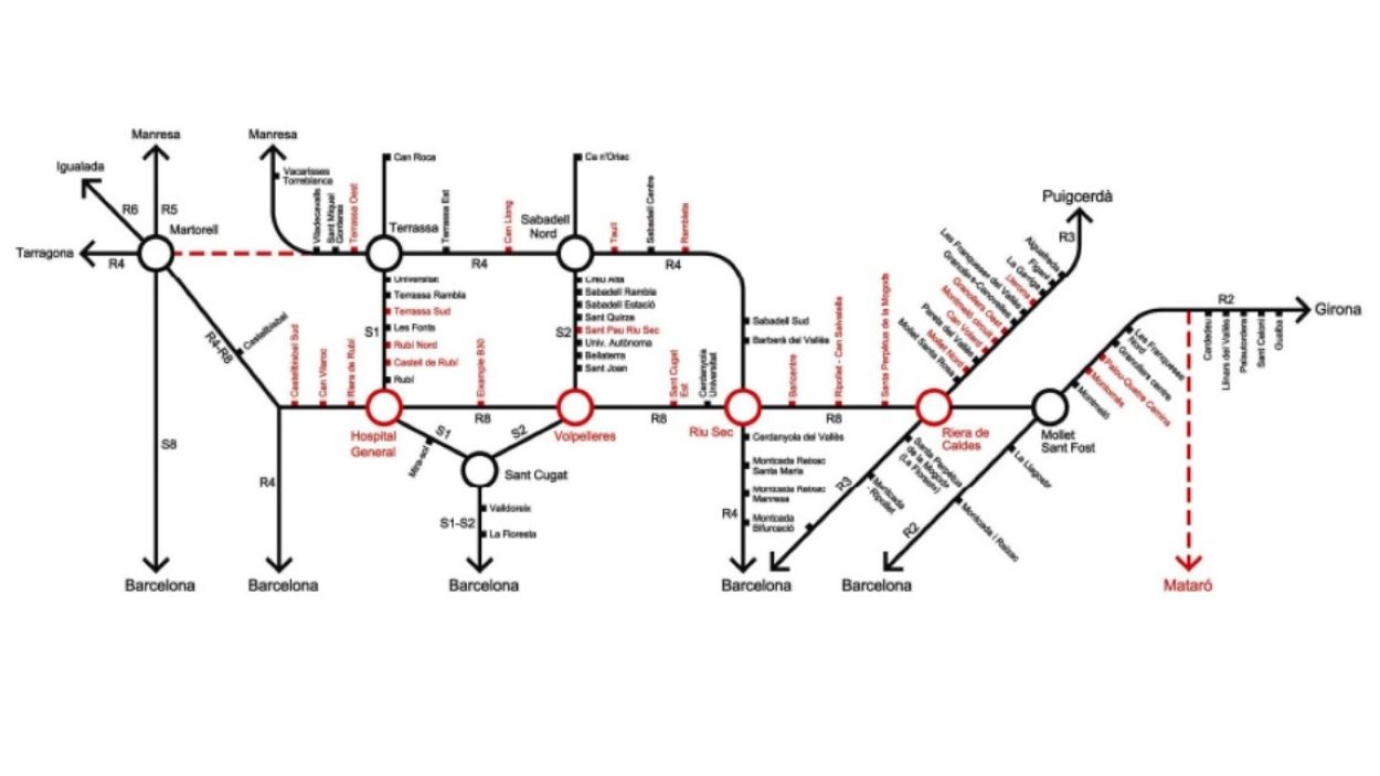 Actualment, no es pot anar de l’Alt Empordà fins a les Terres de l’Ebre en tren sense haver de fer transbord en alguna estació, i això és el que proposa canviar l’associació femVallès, el lobi de les infraestructures. Asseguren que sense haver de fer cap obra, amb les vies actuals de Rodalies, Regionals i Alta Velocitat, la Generalitat -que té les competències del servei de Renfe- podria posar en marxa una nova línia que anés des de Figueres fins a Tortosa sense necessitat de baixar del vagó. Aquesta línia passaria pel Vallès i no faria parada a Barcelona, i en la qual Sant Cugat tindria un paper clau. Des de femVallès comptem amb els dos intercanviadors projectats a Hospital General i a Volpelleres entre els FGC i l’R8 per fer més útil aquesta línia nova.