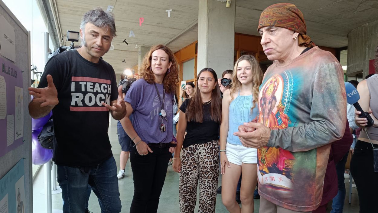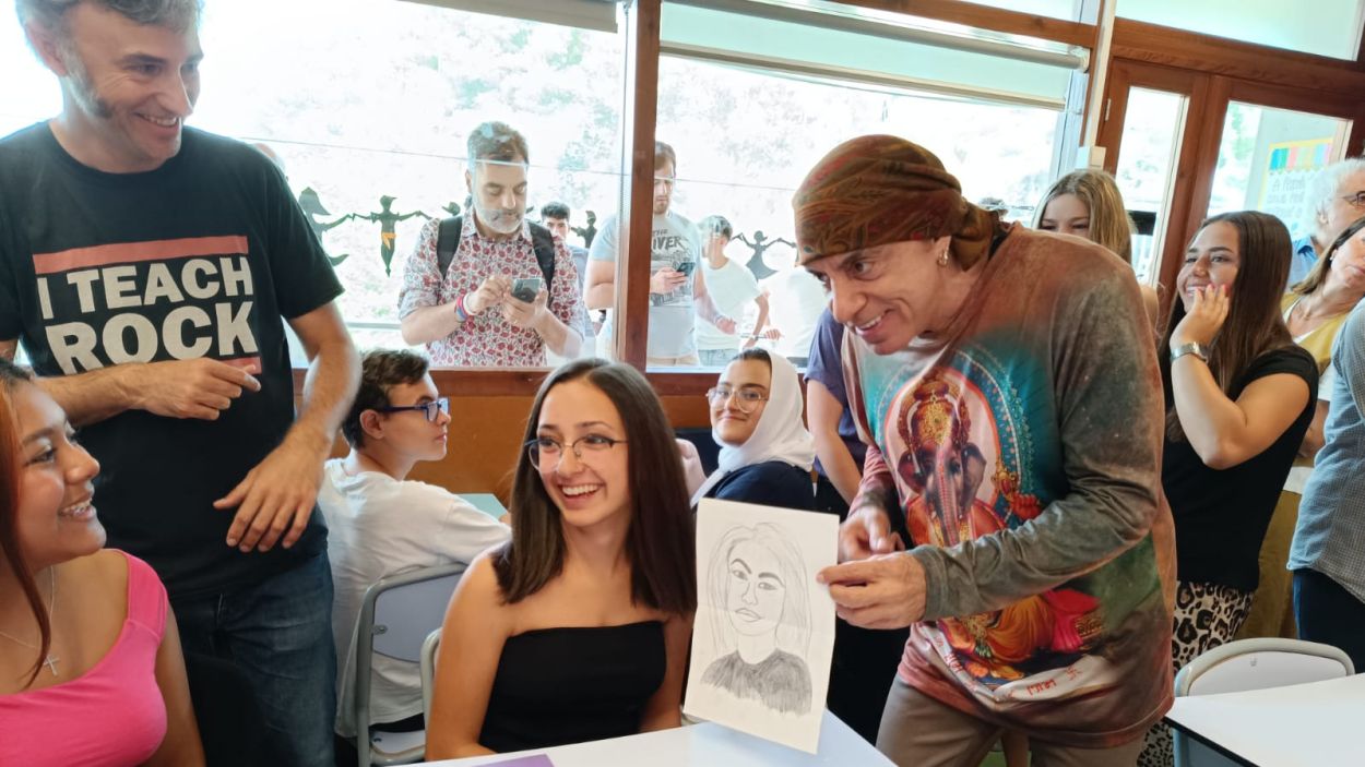 Un moment en què Steve Van Zandt ha entrat en una de les aules de l’escola Thau per parlar amb l’alumnat i interessar-se per la seva feina / Cugat Mèdia