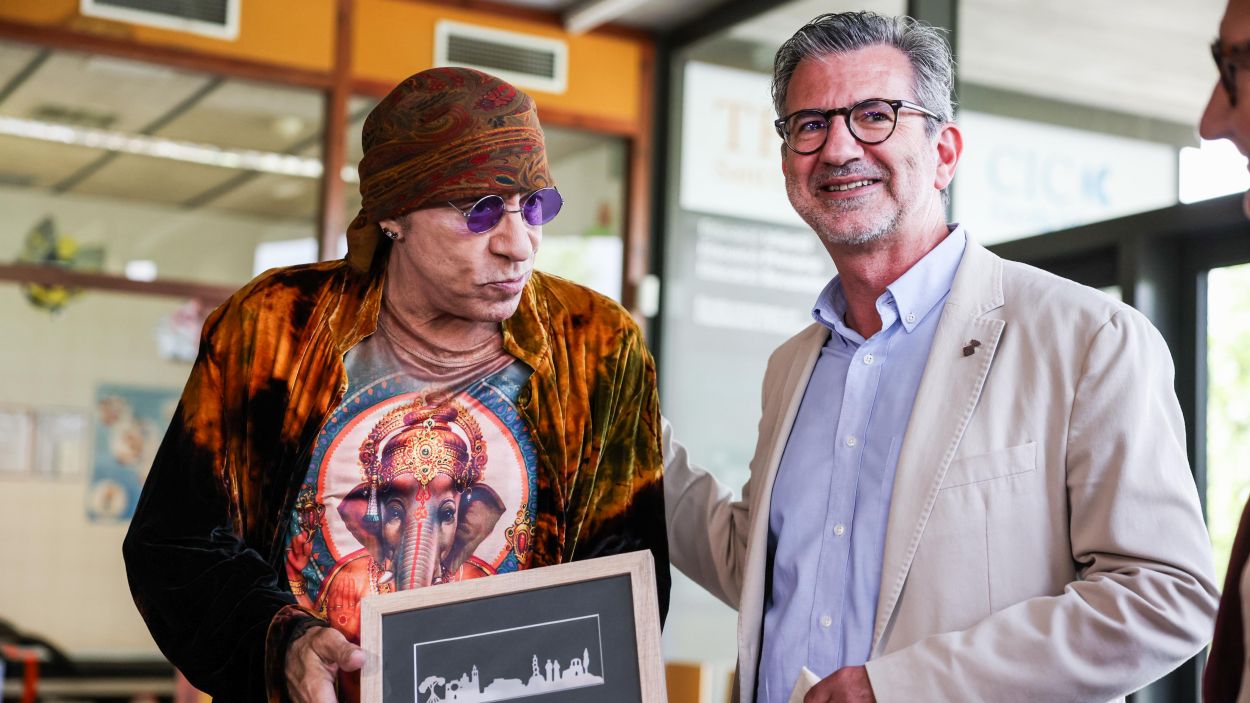El guitarrista de la E Street Band, la banda que acompanya Bruce Springsteen a les seves gires mundials, ha visitat aquest dimecres al matí l’escola Thau de Sant Cugat i l’ha revolucionat de dalt a baix. Steve Van Zandt no ha parat de fer-se fotos amb alumnes de 3r i 4t d’ESO que han participat en el projecte TeachRock durant aquest curs, una iniciativa creada pel mateix guitarrista arreu del món per ‘sacsejar el procés educatiu’ i per posar l’art en el centre de totes les disciplines, com ha explicat el mateix artista. Aquest projecte elabora plans educatius en diferents matèries a partir de la història de la música, i el Thau s’hi va adherir a través del professor d’Economia, gran fan d’Springsteen. Els alumnes i li han ensenyat a Zandt tot el que han fet aquest curs, i el guitarrista s’hi ha mostrat molt interessat i proper en tot moment, en una visita que s’ha allargat més de dues hores.