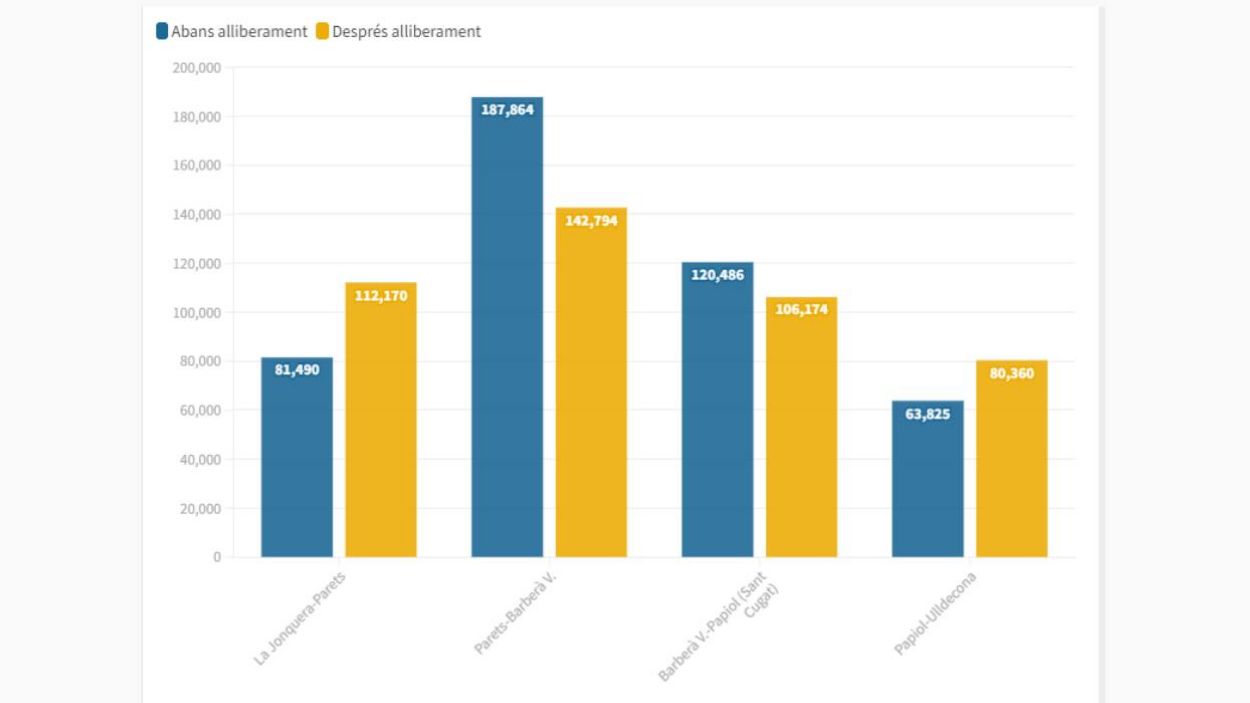 Intensitat mitjana diària (IMD) de vehicles en quatre trams de l’AP7 abans i després de l’alliberament de peatges / Cugat Mèdia