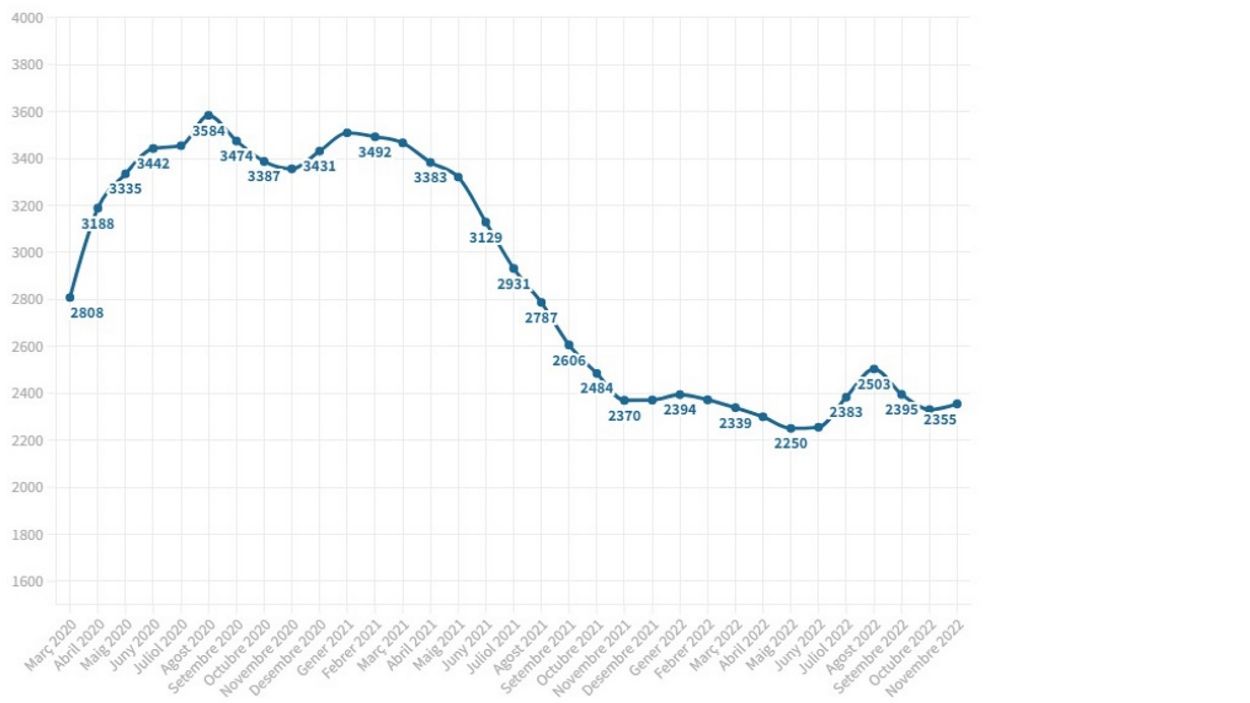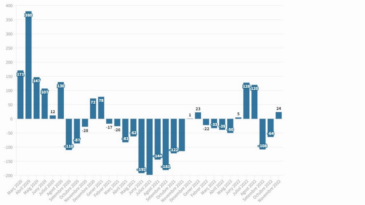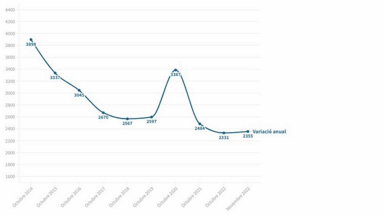L’atur registrat puja 986 persones al novembre a Catalunya, un 0,28% més després de la caiguda rècord de l’octubre, segons les dades del Ministeri de Treball. Tot i l’increment, el nombre d’aturats és de 348.982, la xifra més baixa en aquest mes des del 2007. En comparació amb el novembre del 2021, hi ha 20.840 desocupats menys (-5,6%). Les afiliacions han pujat molt lleugerament (0,01%), amb 519 treballadors més. Tot i l’alentiment de la creació d’ocupació, si es compara amb l’any anterior, hi ha 103.408 empleats més (+2,94%).