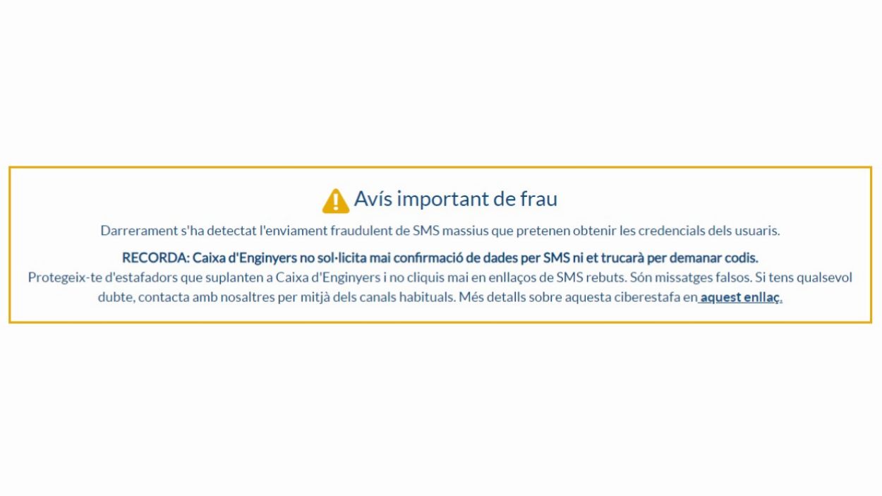 És el cas de la Júlia, que va rebre un SMS suposadament enviat per Caixa d’Enginyers al qual advertien que s’havia iniciat la seva sessió des d’un altre dispositiu i calia verificar via un enllaç la identitat. En clicar, va anar a parar a una web que suplanta Caixa d’Enginyers on hi ha un telèfon per resoldre les incidències i s’avisa que un assessor es posarà en contacte. Poc després va rebre una trucada i la persona que l’atenia li va explicar que rebria un codi per canviar les contrasenyes. El sistema li va semblar sospitós i va trucar directament a Caixa d’Enginyers, on li van confirmar que estaven detectant més casos similars d’aquesta estafa. De fet, la mateixa entitat ha publicat a la seva web