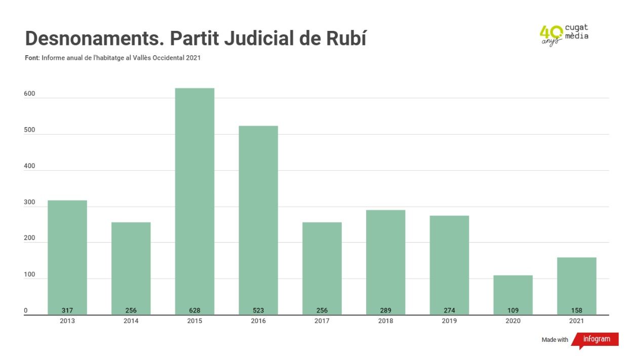 L’Informe Anual de l’Habitatge al Vallès Occidental no recull les dades de desnonaments segmentades per municipis, però sí per partits judicials. En el de Rubí, al qual pertany Sant Cugat, es van registrar l’any passat 158 llançaments. Cal fer un parèntesi en l’any 2020, quan es van comptar al partit judicial 109 desnonaments, ja que durant l’estat d’alarma es van aplicar mesures per paralitzar els llançaments. Entre 2017 i 2019, anualment va haver-hi més de 250 llançaments, lluny dels 523 de 2016 i dels 628 de 2015. Click aquí per ampliar / Cugat Mèdia