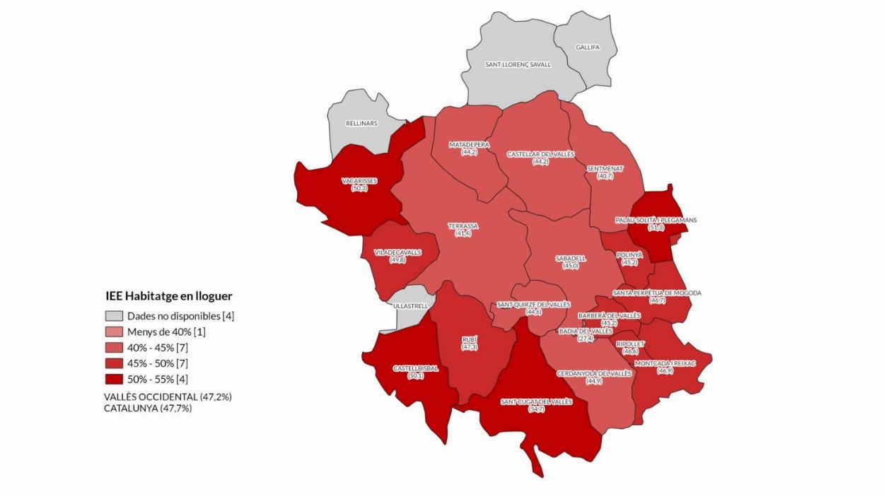 Sant Cugat se situa al capdavant dels municipis vallesans pel que fa a l’esforç que fan els llogaters per pagar les mensualitats, amb un 54,7% de la renda familiar. També superen la meitat dels ingressos Palau-solità i Plegamans (51,3%), Vacarisses (50,3%) i Castellbisbal (50,1%). Pel que fa als municipis propers, a Rubí es destina el 47,3% de la renda; a Cerdanyola, el 44,9%; a Sant Quirze, el 44,6%. Pel que fa a les cocapitals, els terrassencs destinen el 41,4 dels ingressos bruts a pagar el lloguer, mentre que els sabadellencs necessiten el 45% per fer-hi front. Click aquí per ampliar / Foto: Informe Anual Habitatge Vallès Occidental