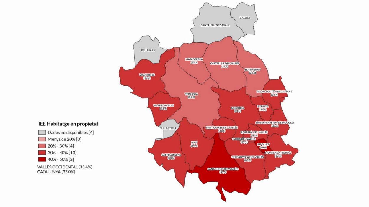 En el cas de l’habitatge de propietat, a Sant Cugat l’esforç no és tan pronunciat com el de lloguer, però, tot i això, la ciutat se situa al capdavant de la comarca, amb un 41,5% dels ingressos bruts de cada unitat familiar destinats a pagar la hipoteca. És un percentatge allunyat dels municipis veïns: a Cerdanyola es destina el 38,5%; a Rubí, el 34,4%; a Sant Quirze, el 31,8%. Per la seva banda, a Sabadell s’hi destina el 31%, mentre que a Terrassa l’esforç és del 29,5%. Click per ampliar / Foto: Informe Anual de l’Habitatge al Vallès Occid