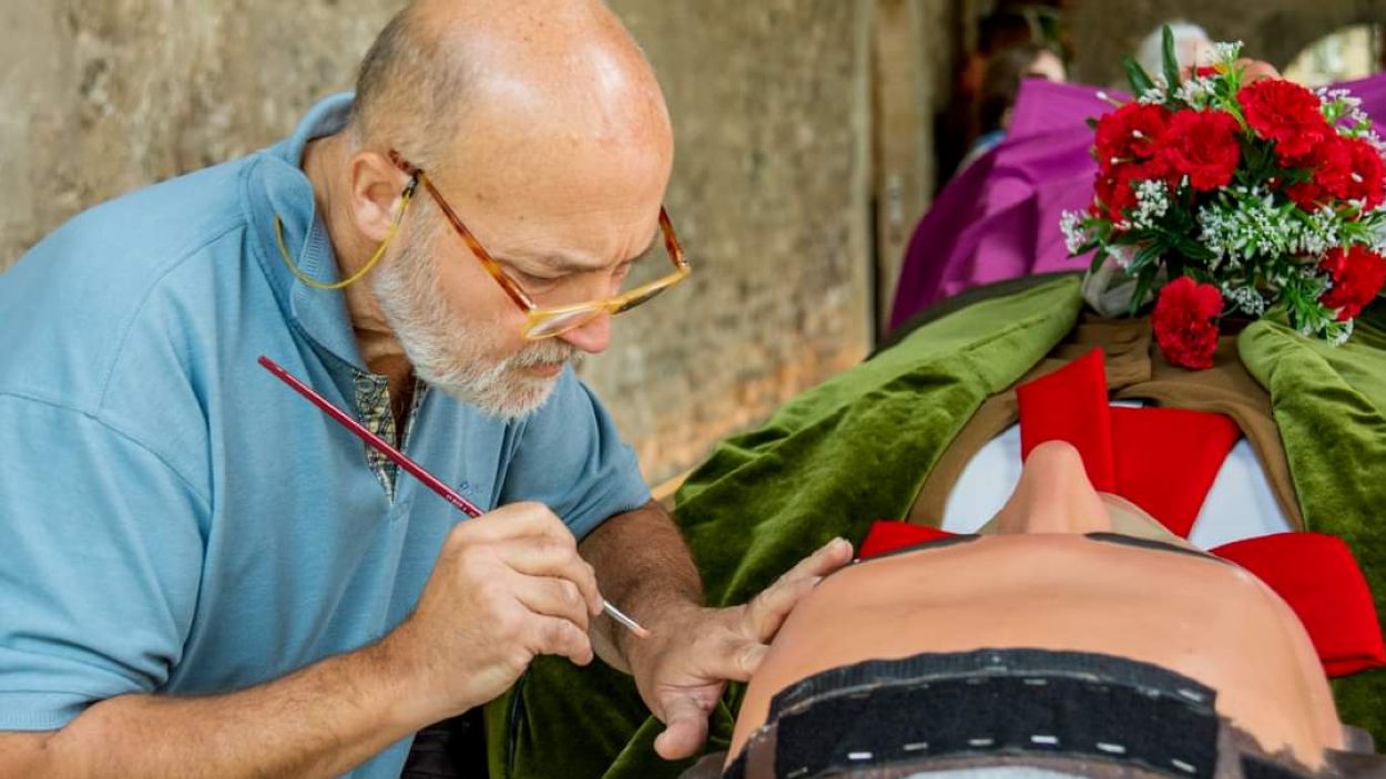 L’artista Adolf arranjant els desperfectes del Joan / Geganters de Sant Cugat