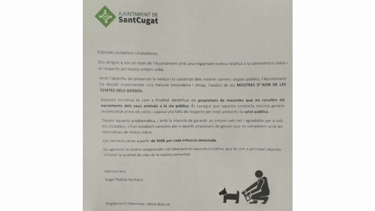 L’Ajuntament desmenteix la informació que s’ha difós mitjançant una nota falsa sobre la implementació d’una nova mesura per identificar els propietaris d’animals que no recullin els excrements de la via pública. L’escrit; que porta la capçalera de l’Ajuntament de Sant Cugat i està signada com si hagués estat escrita pel regidor d’Urbanisme i Medi Natural, Àngel Pedrós; informa de la realització d’anàlisis des le mostres d’ADN de les femtes de gos per sancionar els propietaris que no les recullin, amb multes a partir de 300 euros. Tal com ha informat l’Ajuntament a Cugat Mèdia, no està previst implementar aquesta mesura ni cap de similar.