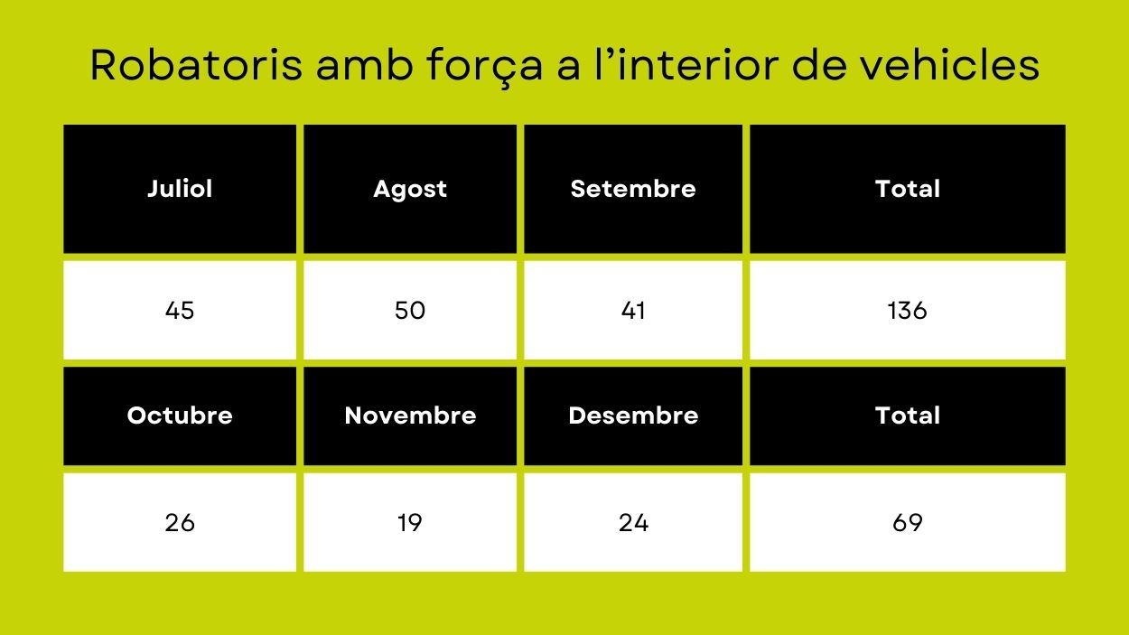 L’onada de robatoris amb força a l’interior de vehicles està sota control. Segons els Mossos d’Esquadra, el darrer trimestre de l’any s’han reduït a la meitat les denúncies per aquest fet delictiu, mentre ha estat en marxa l’operatiu policial específic per fer front a l’increment d’aquests robatoris. La coordinació entre els Mossos i la Policia Local, la campanya informativa, i el suport de drons han permès diverses detencions i identificacions vinculades als robatoris. Ara el cos valora si cal allargar aquest operatiu.