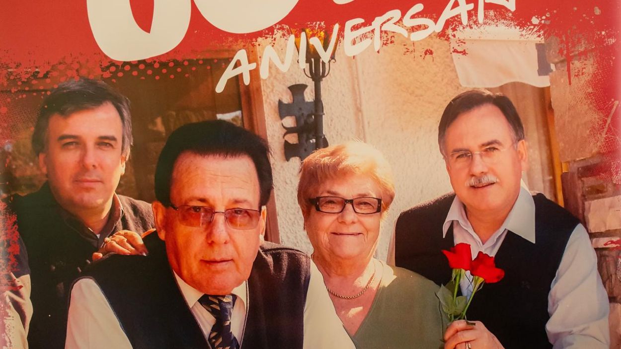 Pòster del 60è aniversari del restaurant amb els fundadors, Gerard i Maria, i els fills i actuals propietaris, Josep Maria i Guillem / Cedida Rancho El Paso