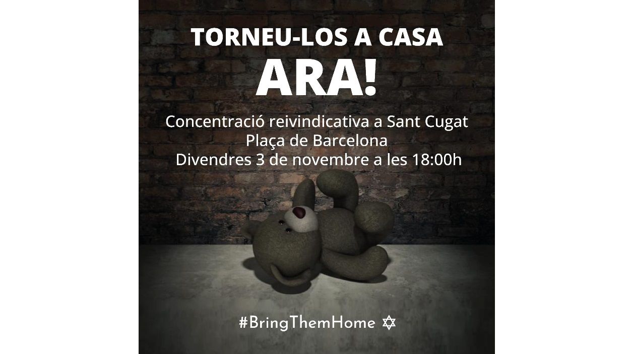 La comunitat jueva de Sant Cugat, la més nombrosa de Catalunya, ha convocat una manifestació aquest divendres 3 de novembre a la plaça de Barcelona a les 18 h. La majoria dels convocants són pares i mares que porten els seus fills a l’escola Hatikva, l’única escola jueva de Catalunya amb seu a Sant Cugat, tot i que hi ha altres famílies jueves de la ciutat que també s’hi han afegit. El lema principal de la convocatòria és ‘Torneu-los a casa, ara!’, per reclamar l’alliberament dels israelians segrestats per Hamas el 7 d’octubre passat.