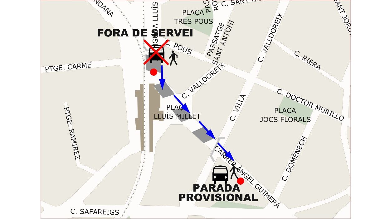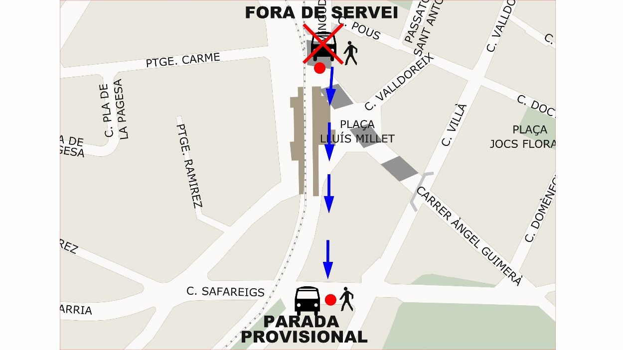 Aquesta mateixa línia però en direcció contrària (L1 – Torrent dels Ferrussons) no queda afectada perquè no passa per la pl. Lluís Millet i fa parada al carrer Safareig.
