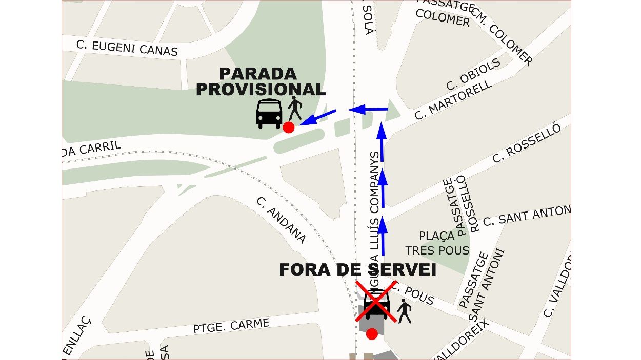 Línies nocturnes (N61, N62 i N64). El bus es desviarà des del carrer de Lluís Companys en direcció al carrer Safareigs, on tindrà la nova parada.