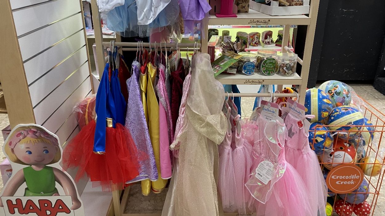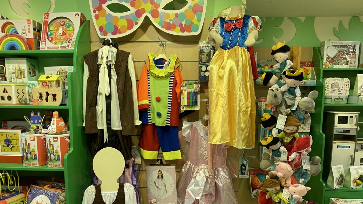 Interior de la botiga de joguines Eurekakids amb algunes de les disfresses que tenen exposades / Cugat Mèdia