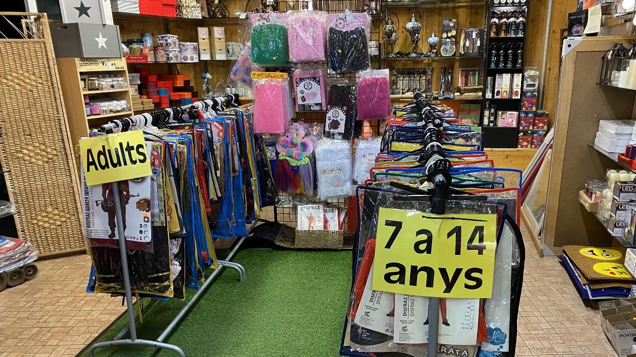 Interior de la botiga de disfresses i material Mil i una troballes amb les disfresses dividides per edats / Cugat Mèdia