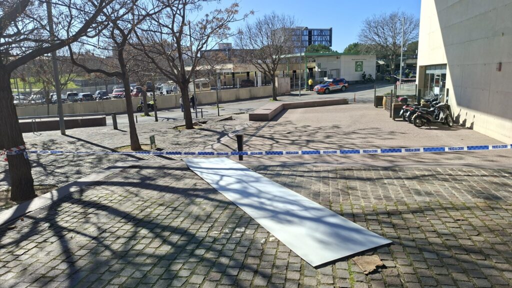 Una placa d’un edifici despresa a causa del vent al carrer Antoni Bell / Cedida