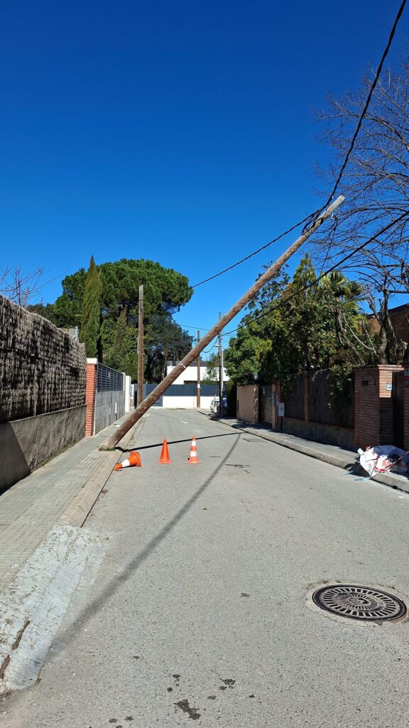 Un pal de corrent elèctric tombat a causa del vent a Valldoreix / Foto: EMD Valldoreix