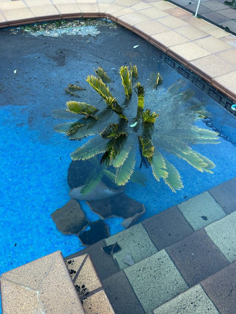 Una palmera caiguda a la piscina d’un particular a causa del vent / Foto: Cedida
