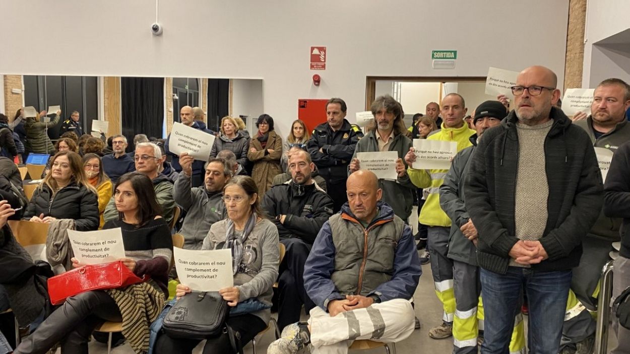 Aquest punt de l’ordre del dia ha comptat amb la presència de diversos treballadors del consistori, que han expressat el seu malestar amb cartells que es preguntaven quan cobrarien el nou complement de productivitat.