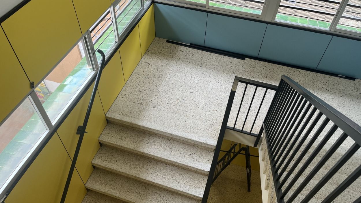 Imatge de les escales de l’escola La Floresta on es veu l’actuació a l’interior / Cugat Mèdia