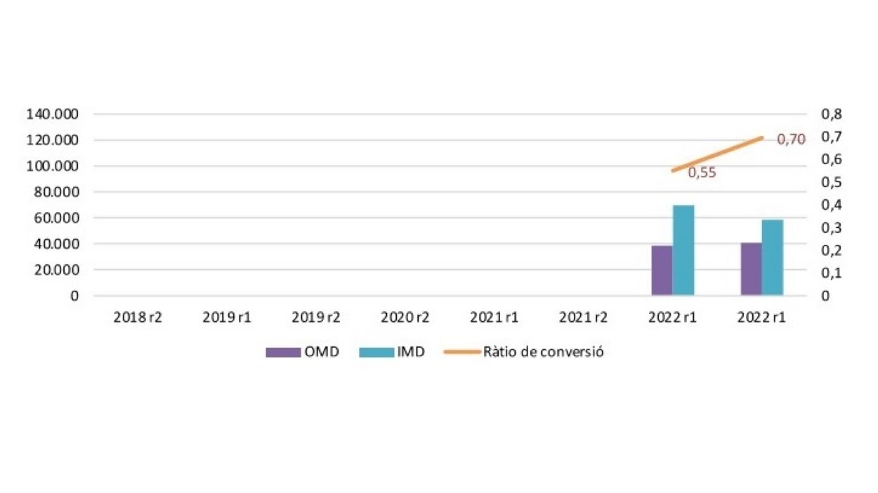 Com s’observa a la imatge, la intensitat mitja diària (IMD) de vianants ha passat de 83.386 durant el primer semestre de 2021, a 53.723 en el segon semestre de 2022. Això suposa un descens del 37% en dos anys. No obstant això, el següent gràfic mostra l’estimació d’operacions mitjana diària (OMD), que és la relació entre els tiquets recollits, el cens i el nombre d’establiments consultats; la IMD; i la ràtio de conversió, que s’aconsegueix dividint l’OMD i l’IMD. El resultat indica el grau d’eficiència de la IMD, és a dir, quantes compres es fan segons en nombre per persones que circulen pel centre de la ciutat.