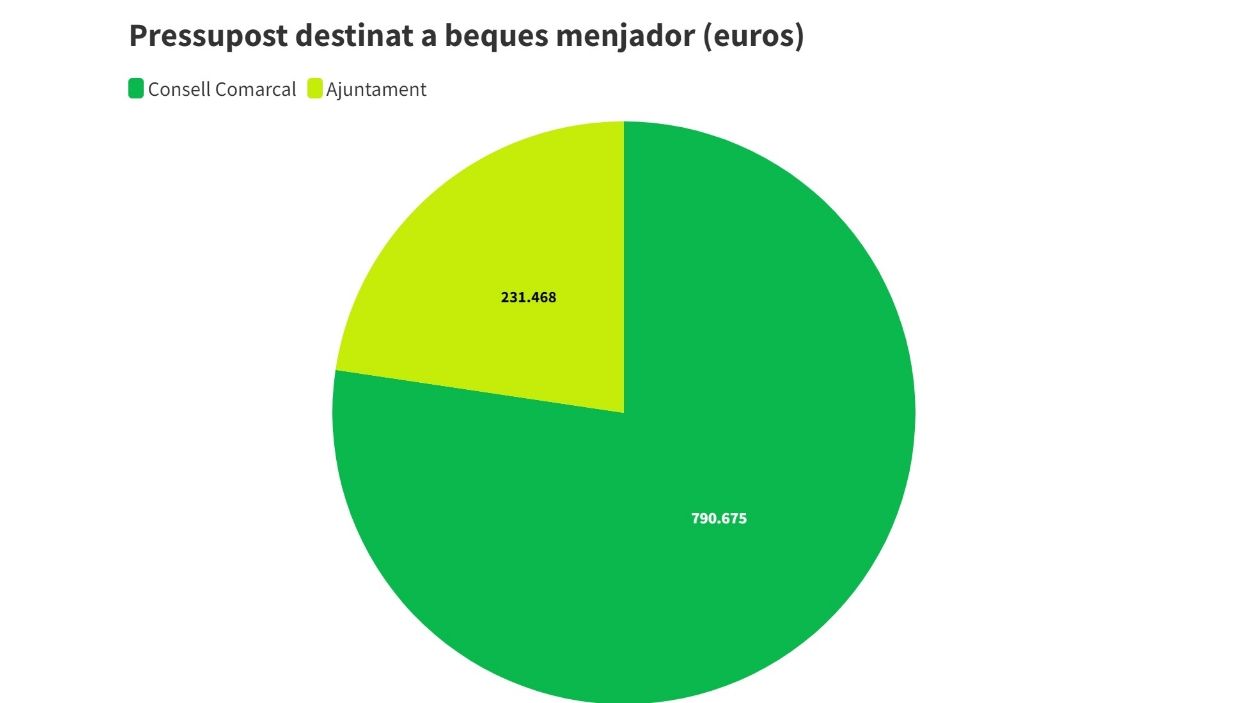 A banda de les 145 beques menjador que lliura directament, l’Ajuntament també complementa els ajuts del 70% que ofereix el consell comarcal, elevant el percentatge de la beca fins al 85%. Així, de les 1.330 ajudes que lliura l’administració supramunicipal, 1.121 cobreixen el 85% i 209 arriben al total. Durant el curs passat es van destinar 1,02 milions d’euros a ajuts menjador a Sant Cugat. D’aquest import, 790.675 els aporta el consell comarcal i l’Ajuntament hi destina 231.468 euros.