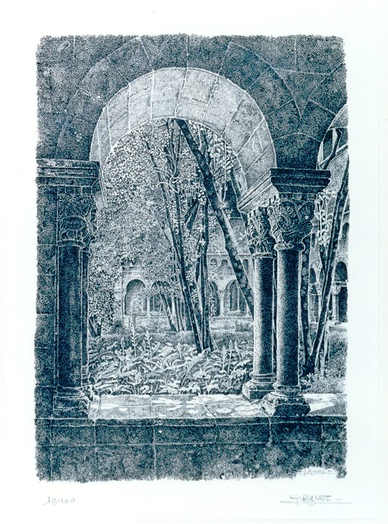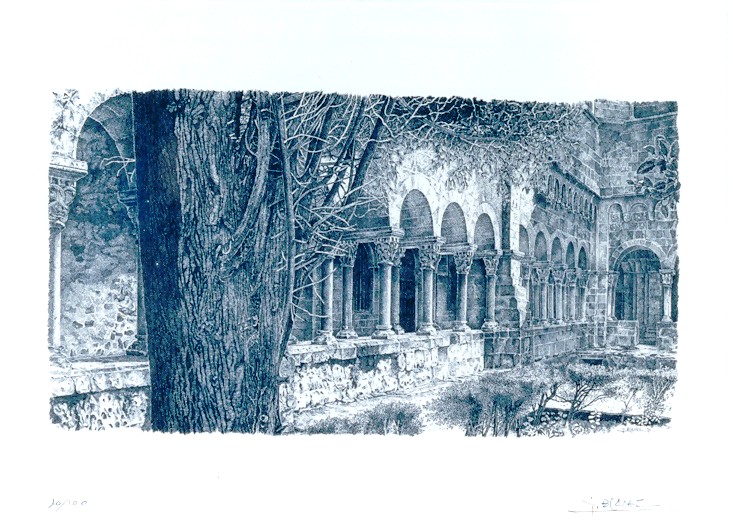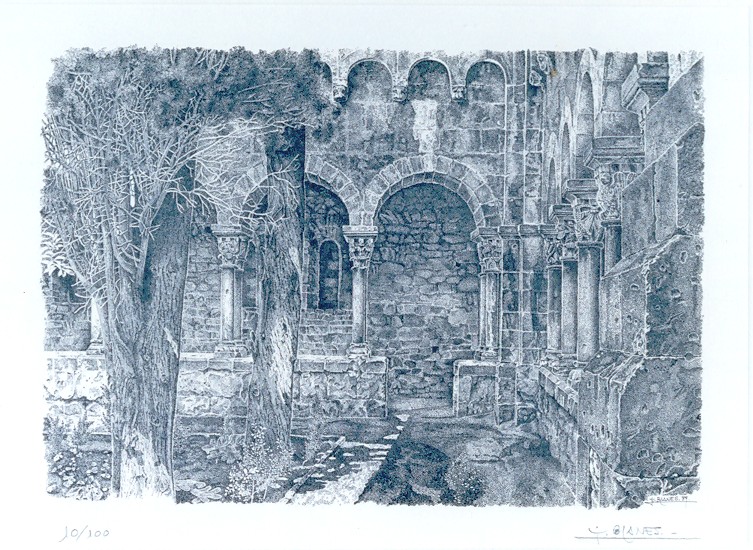 Van ser 35 anys dibuixant molts espais, sobretot, del Claustre i els capitells, amb un treball minuciós que va exposar diverses vegades a la sala capitular. De les seves estones llargues al Claustre, fins i tot en dies festius, va fer popular la tradicional cadira de fusta on Blanes seia per immortalitzar els dibuixos. A la trilogia “Pedra i Ploma”, va explicar la seva mirada artística de la història del Monestir.