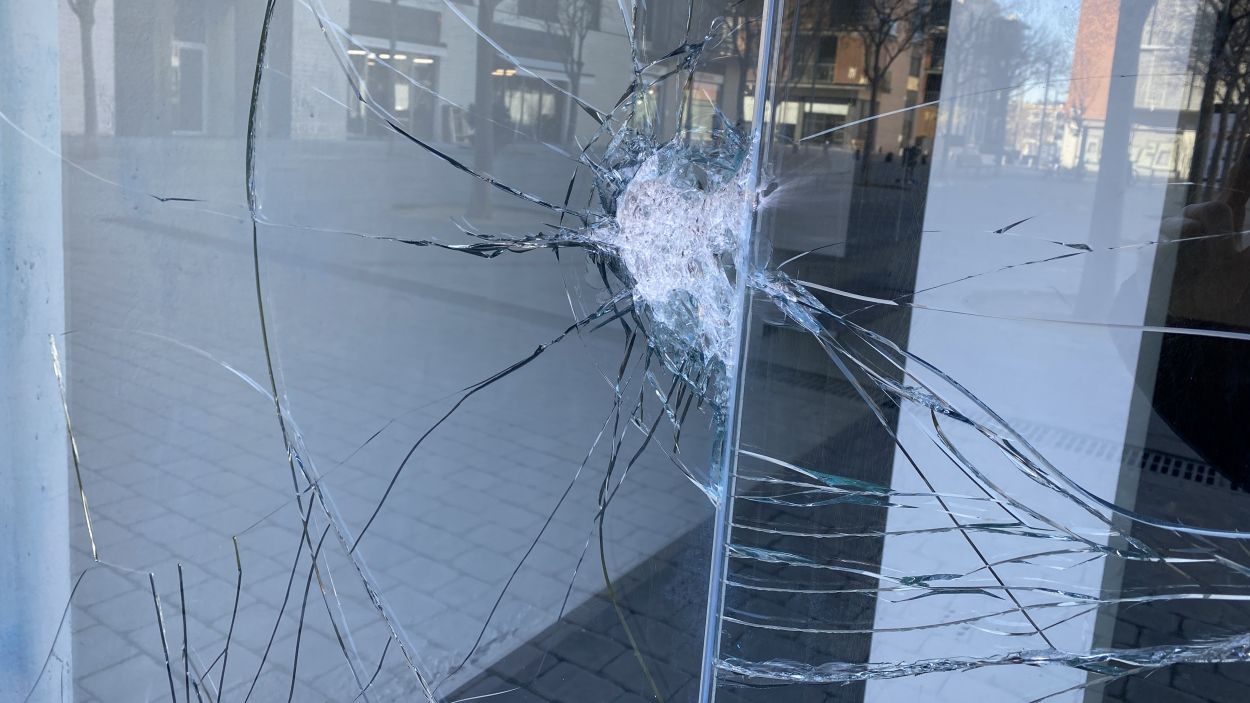 El vidre trencat de l’entrada de l’immoble de la plaça dels Rabassaires / Cugat Mèdia