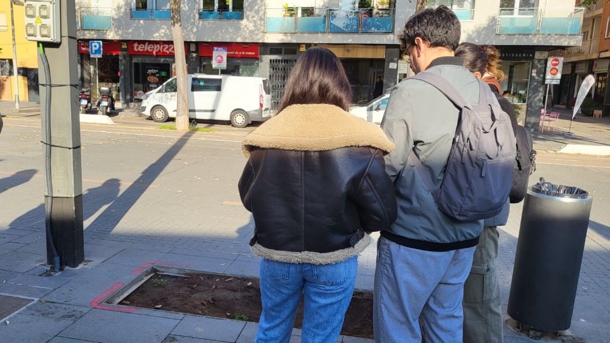 Els estudiants de l’ETSAV amb personal de l’Ajuntament registrant un problema amb un escocell a la Rambla del Celler / Cugat Mèdia