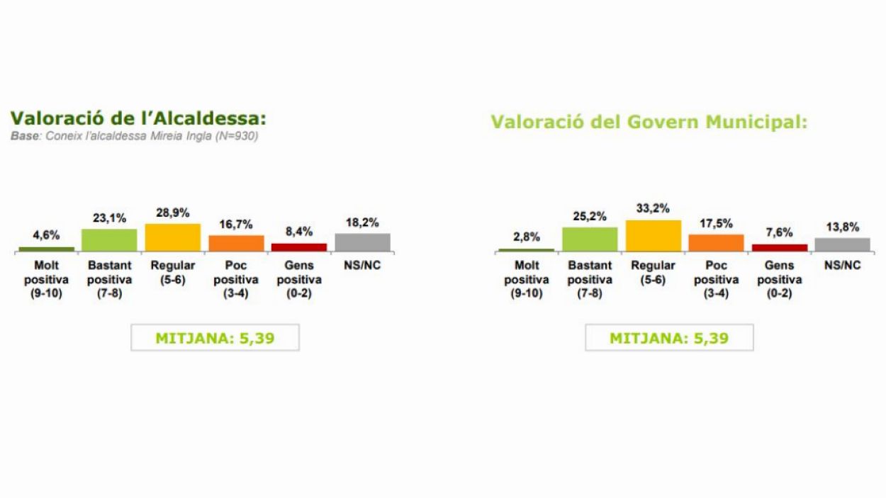 Així, l’alcaldessa, Mireia Ingla, aconsegueix un 5,4 de mitjana, la mateixa que obté el govern municipal. La millor nota obtinguda per un alcalde va ser l’octubre del 2010 amb Lluís Recoder, que va aconseguir un 7,3. També aquell equip de govern va assolir la millor nota amb un 6,8.
