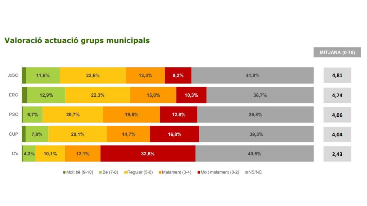 Els grups municipals tampoc obtenen grans notes dels santcugatencs. De fet, tots els partits suspenen. Junts per Sant Cugat és el que s’aproxima més a l’aprovat, seguit d’ERC, el PSC i la CUP. Cs es queda en un 2,43. COM VALOREN L’ESTAT DE LA CIUTAT ELS SANTCUGATENCS? RECUPERA LA PRIEMRA PART DE L’OBSERVATORI