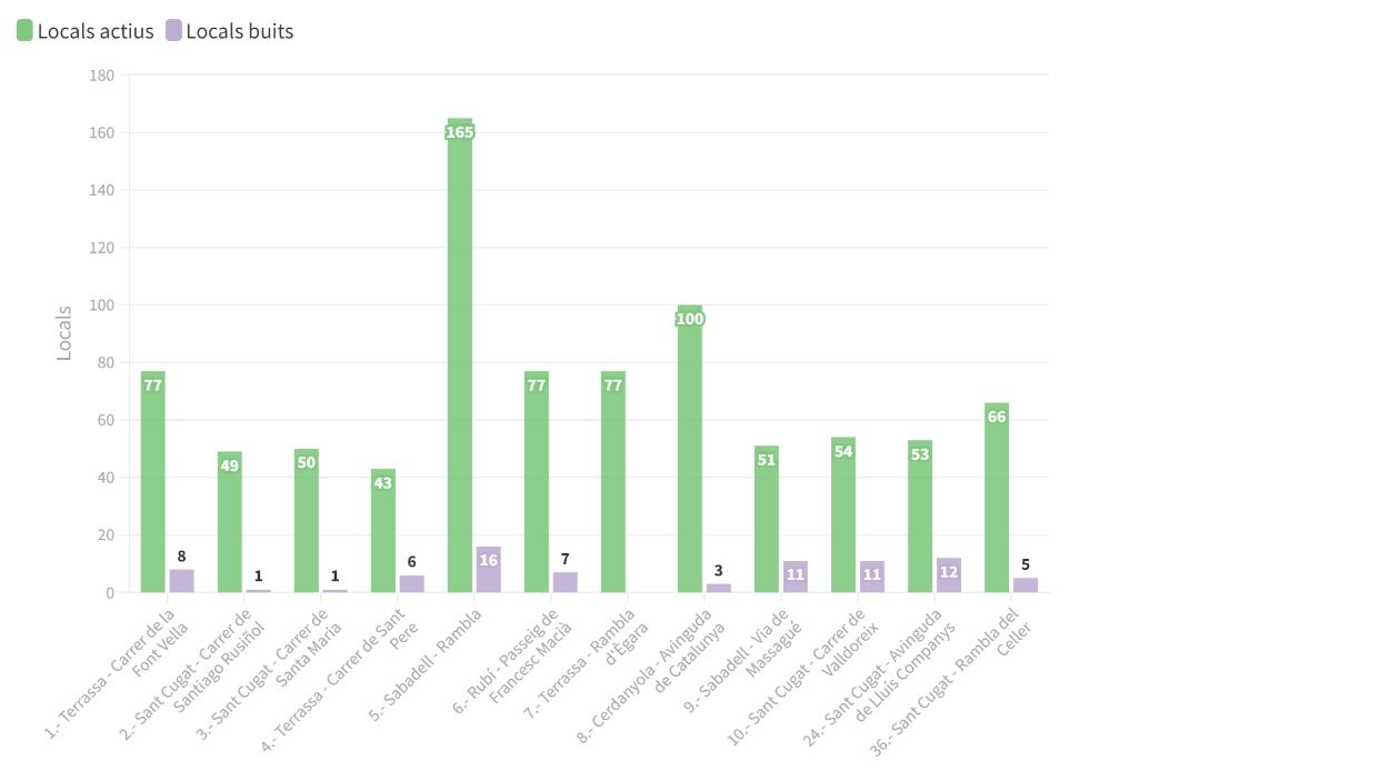 D’altra banda, Sant Cugat també té una presència destacada quan el rànquing s’elabora tenint en compte els eixos comercials i no la globalitat dels municipis. Així, els carrers que uneixen l’estació dels FGC amb la plaça d’Octavià es troben al top 10. El carrer de Santiago Rusiñol és el segon, amb 49 locals ocupats i un de buit; el de Santa Maria, el tercer, amb 50 locals actius i un inactiu; i el de Valldoreix es troba al desè lloc, amb 54 locals amb activitat i 11 sense. Locals comercials als eixos comercials de la comarca / Font: Consell Comarcal Vallès Occidental / Cugat Mèdia