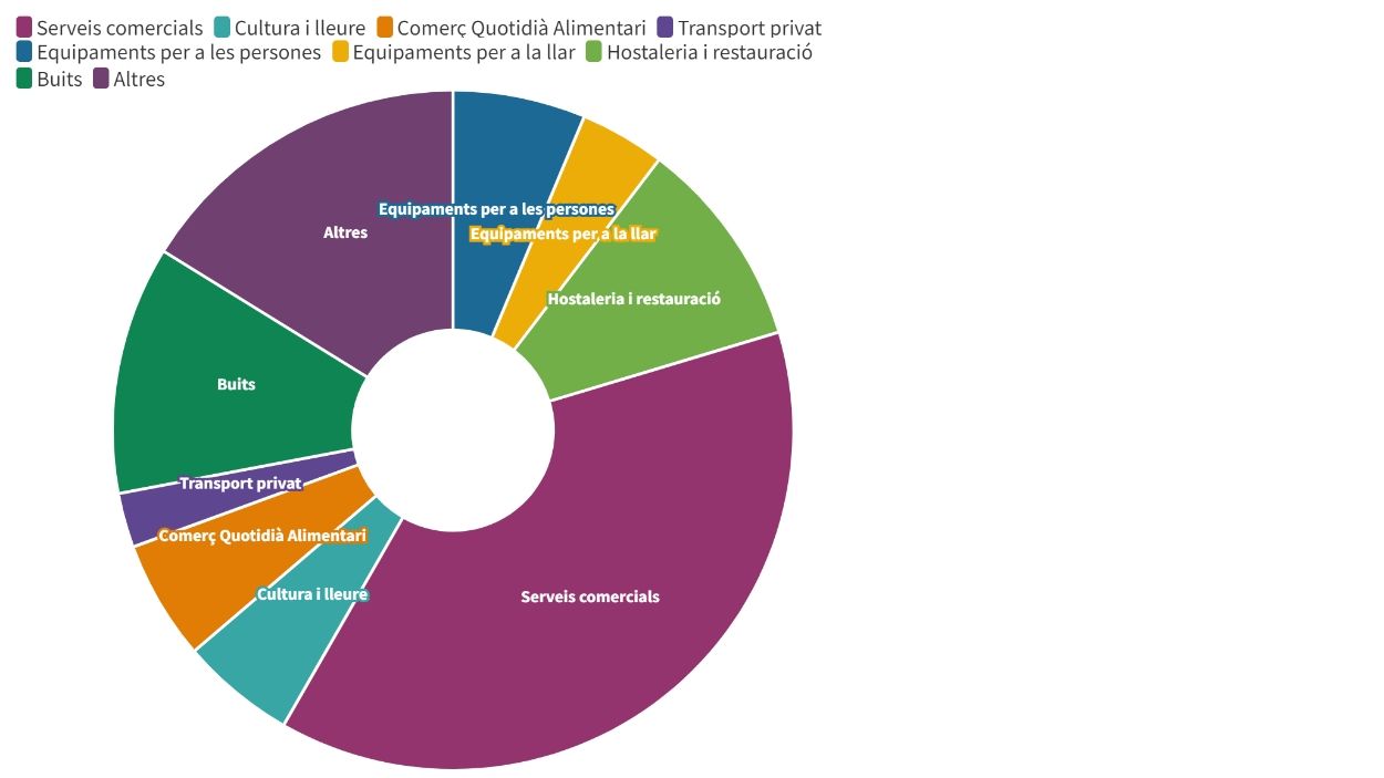La gran majoria de locals de Sant Cugat (1.349) ofereixen serveis comercials (una classificació que inclou des d’agències de viatge fins a locutoris i administracions de loteria, passant per perruqueries, botigues per a mascotes i bancs). La tipologia d’activitat de la resta d’espais està més repartida: hostaleria i restauració (355), equipaments per a la persona (224), alimentació (202), cultura i lleure (194), equipaments per a la llar (144), serveis de transport privat (92) i altres (575). Tipus d’activitats comercials a Sant Cugat / Font: Consell Comarcal Vallès Occidental / Cugat Mèdia
