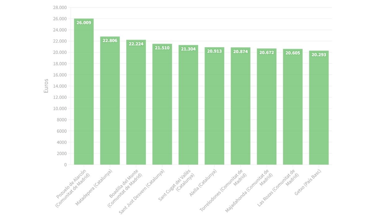 destaquen que a Catalunya el 49,1% dels municipis estan entre el 25% més rics de l’Estat. En concret, entre les 10 ciutats més riques de l’Estat n’hi ha quatre de la demarcació de Barcelona. A banda de les anteriors, també hi ha Alella (Maresme), amb 20.913 euros de renda mitjana anual. La resta de posicions les ocupen municipis de Madrid i un de Biscaia. La localitat amb més renda mitjana anual de l’Estat per habitant és Pozuelo de Alarcón (Madrid), amb 26.009 euros. De Catalunya, entre els més rics de l’Estat també hi ha Tiana (Maresme), amb 19.630 euros; Cabrils (Maresme), amb 19.516 euros; Cabrera de Mar (Maresme), amb 19.249 euros; Sant Vicenç de Montalt (Maresme), amb 18.816 euros; Teià (Maresme), amb 18.648 euros; l’Ametlla del Vallès (Vallès Oriental), amb 18.514 euros; Riudarenes (La Selva) amb 18.415 euros; Sant Julià de Vilatorta (Osona), amb 18.375 euros; i Fornells de la Selva (La Selva), amb 18.273 euros.