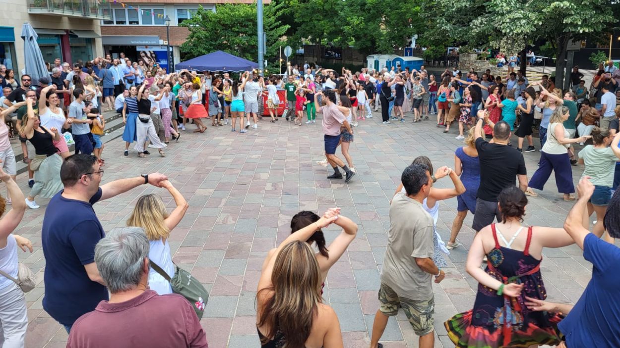 La plaça de Can Quiterià s’ha bellugat sencera a ritme del swing de la classe oberta de lindy hop. La parella formada per Ibon i Berta ha contagiat el ritme del ball als santcugatencs que no s’han pogut resistir a moure els malucs.