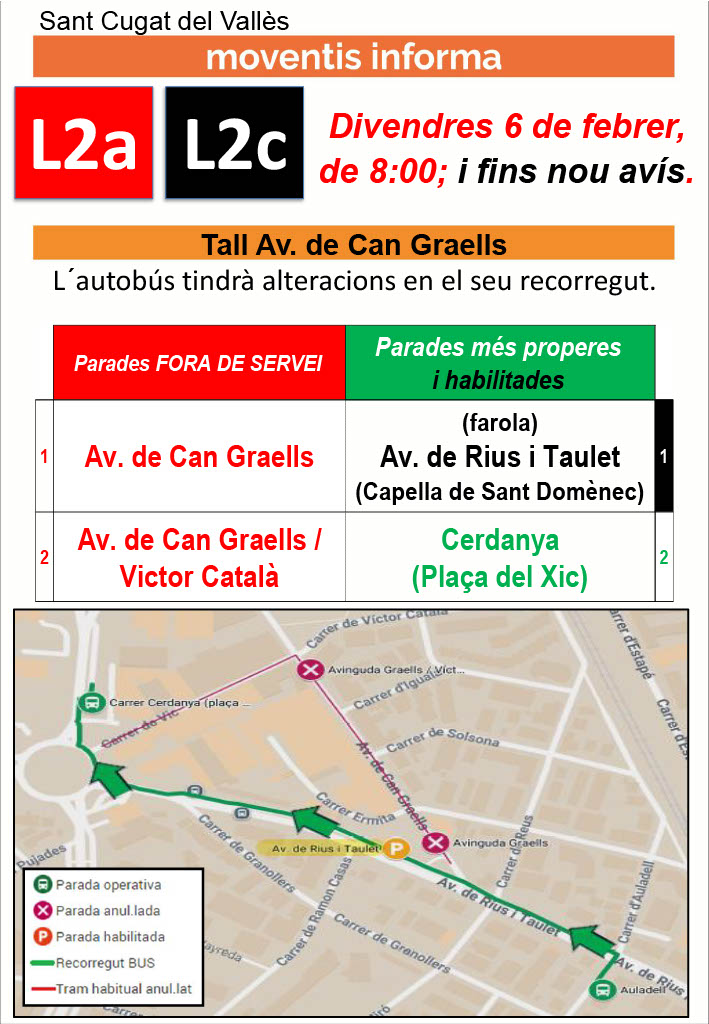 L’afectació també repercuteix en el transport públic: les línies d’autobús urbà L2a i L2c modifiquen el seu recorregut i queden fora de servei les parades d’avinguda Graells i avinguda Graells/Víctor Català. Com a alternatives, s’habiliten les parades de l’avinguda Rius i Taulet (capella de Sant Domènec) i Cerdanya (plaça del Xic).