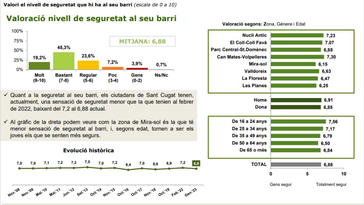 Un 6,7% dels santcugatencs ha patit, o algú amb qui conviu ha patit, algun tipus de robatori a la ciutat durant l’últim any, com pot ser un robatori dins del cotxe o dins de casa. És una dada que apareix en el darrer Observatori Sociològic, que també revela que el miler d’enquestats posa un 6,8 al nivell de seguretat de Sant Cugat i del seu barri en particular. El regidor de Seguretat, Francesc Carol, ha recordat que sovint la sensació d’inseguretat i la inseguretat real que indiquen les dades de delictes van per separat, però admet que a vegades coincideixen, com passa al barri de Mira-sol.